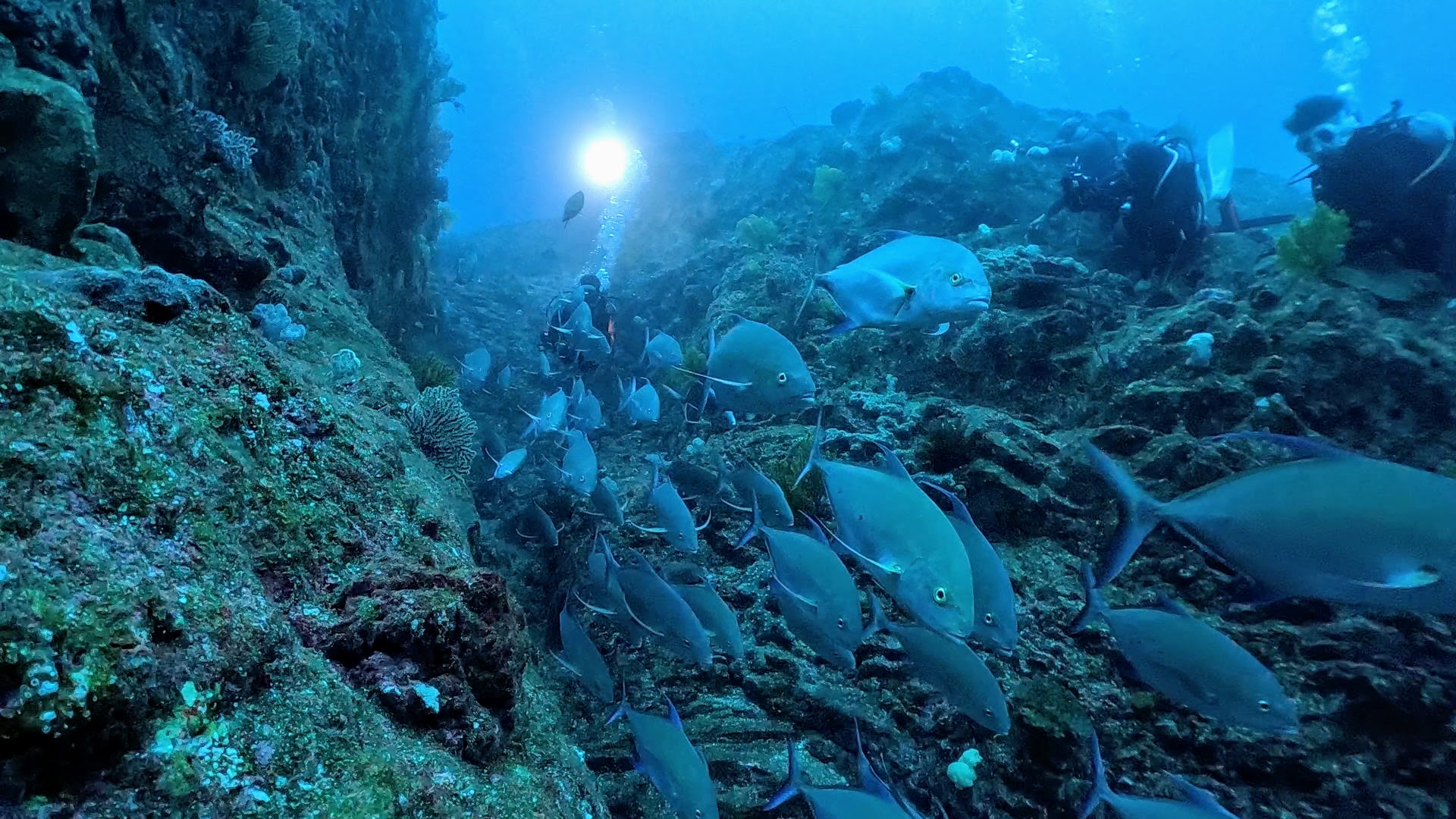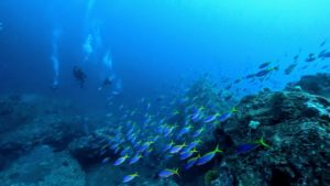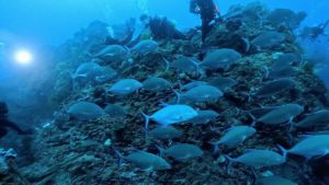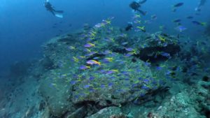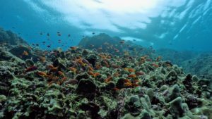 谷の斜面を覆うサンゴ礁ではキンギョハナダイや