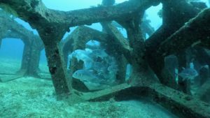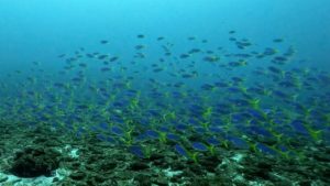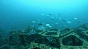 漁礁の中をグルグルと泳ぎ回るロウニンアジの群れが