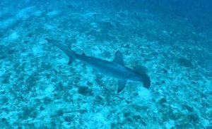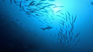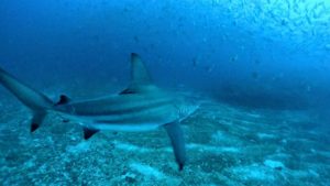 バラクーダの群れの中から現れたのがカマストガリザメ!