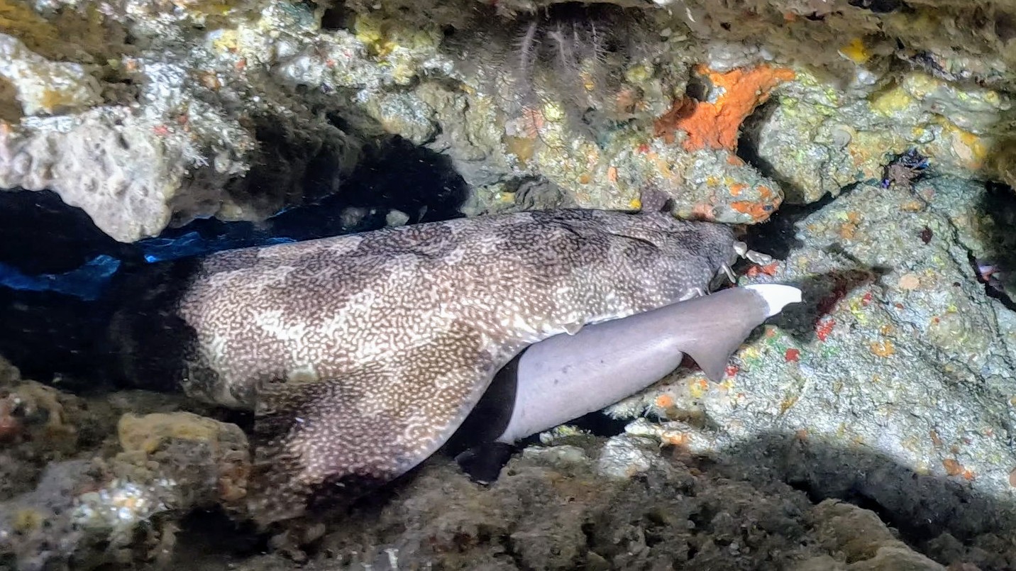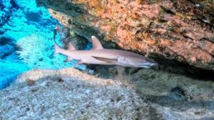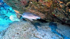 オーバーハングでは奥に大人のネムリブカが寝ていて