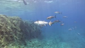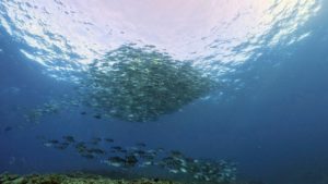 ギンガメ玉の下ではイソマグロの群れが遊泳。