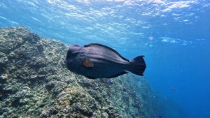 今回、浅い根でのんびりと泳ぐカンムリブダイも