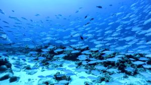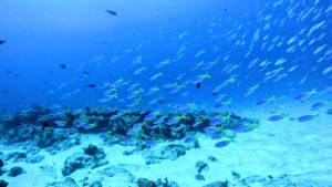 カスミチョウチョウウオの大群はドロップオフ沿いで