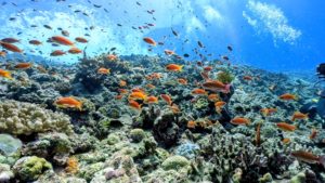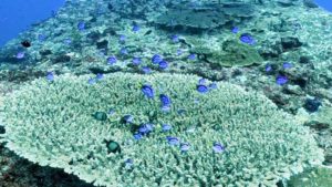 潮流の速い浅場のサンゴ礁ではキンギョハナダイの大群が