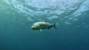 キンギョハナダイなどが群れる浅場ではロウニンアジ3尾が集会中。
