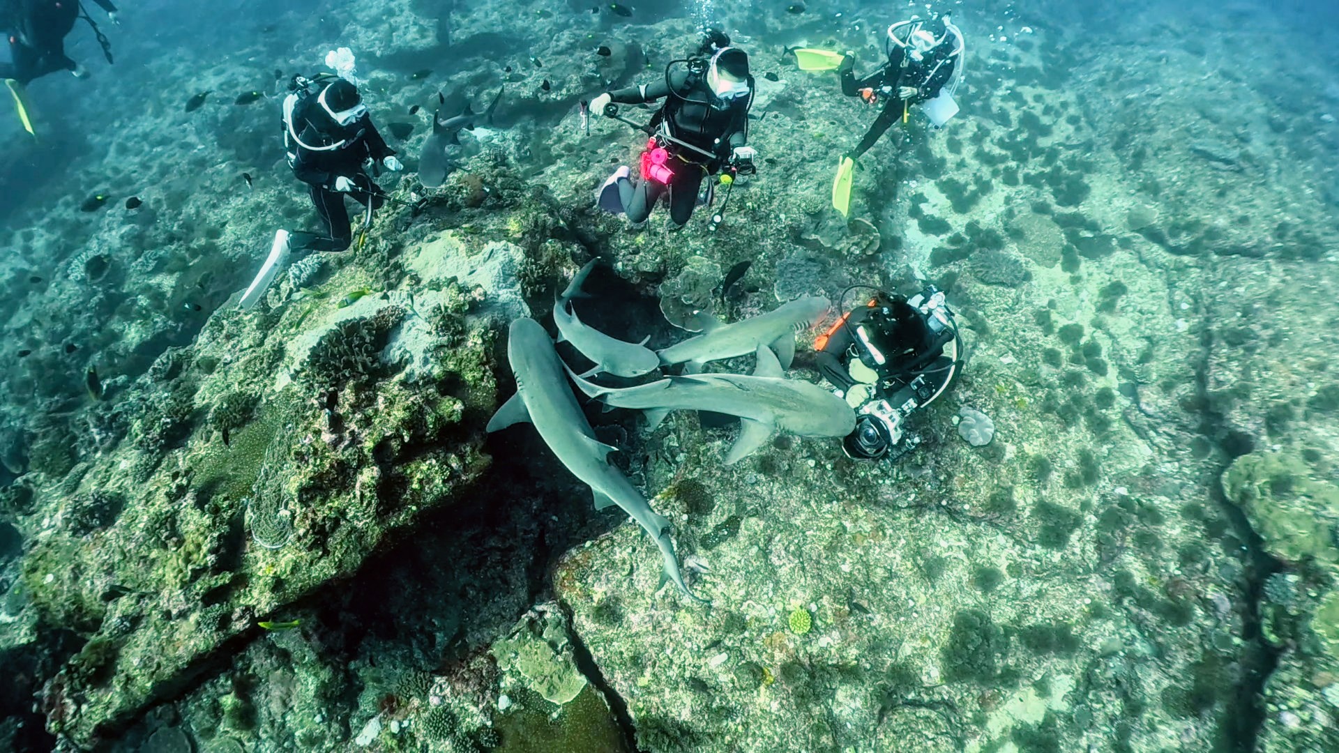 潜降したとたん、ホワイトチップシャークの群れによる