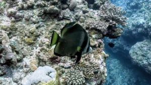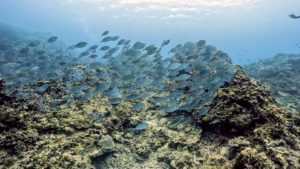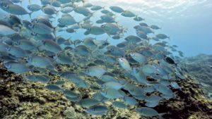 サンゴ礁の上をハナアイゴの大きな群れが餌を物色しながら