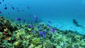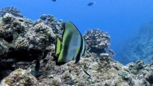 サンゴ礁の斜面ではハナゴイが舞っていました。