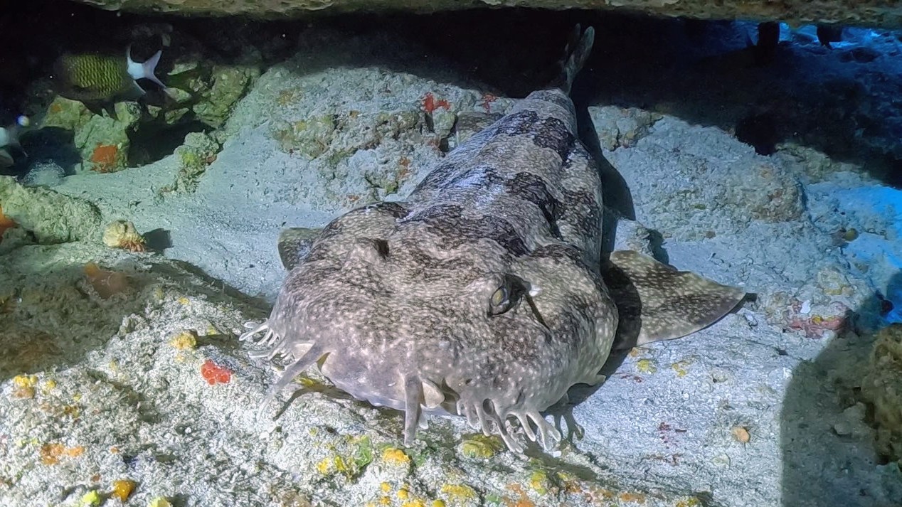 浅場のクレバスの中にホワイトチップシャークが2匹潜んでいました。