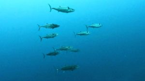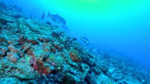 水深30mを超える岩盤ではカスミアジが群れていました。